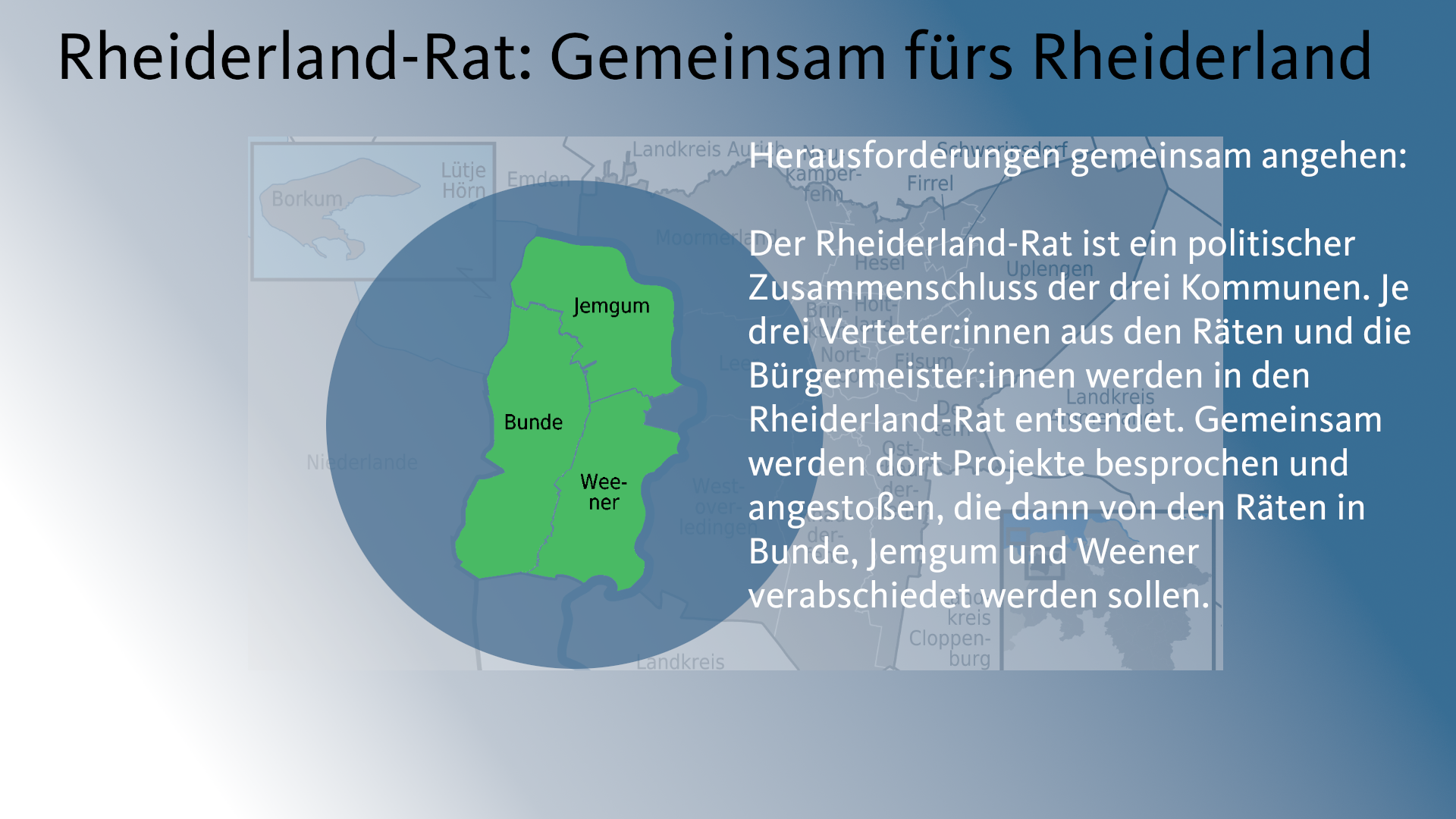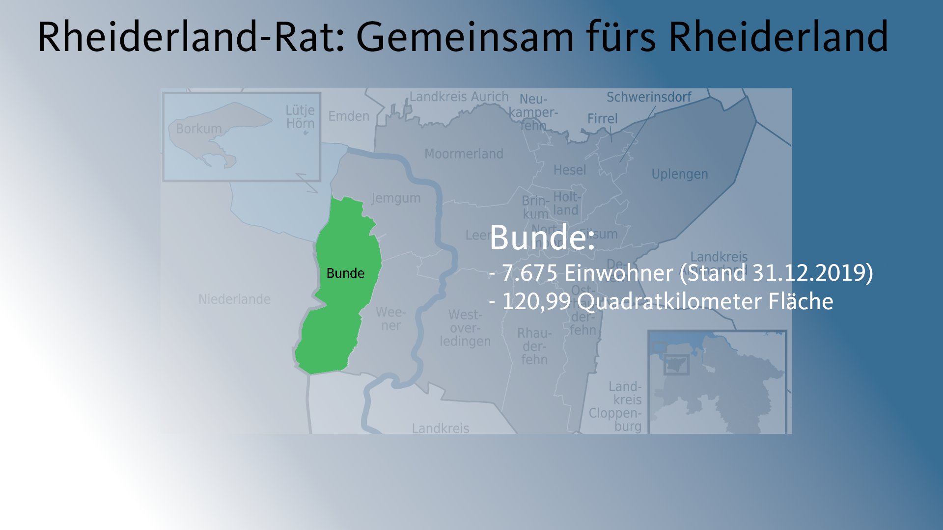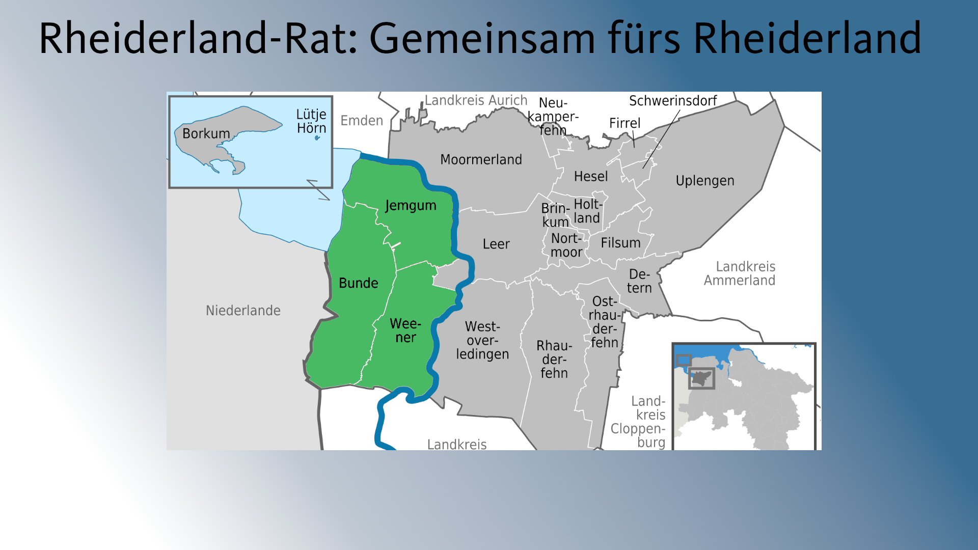 Bunde, Jemgum, Weener – Eigentlich sind wir doch alle Rheiderländer. Darum sollten wir auch enger miteinander zusammenarbeiten. Meine Idee (hier zum Download in Textform) dafür ist der Rheiderland-Rat. Hier gibt es alle Infos dazu – Scrollt Euch einfach durch die Präsentation.
