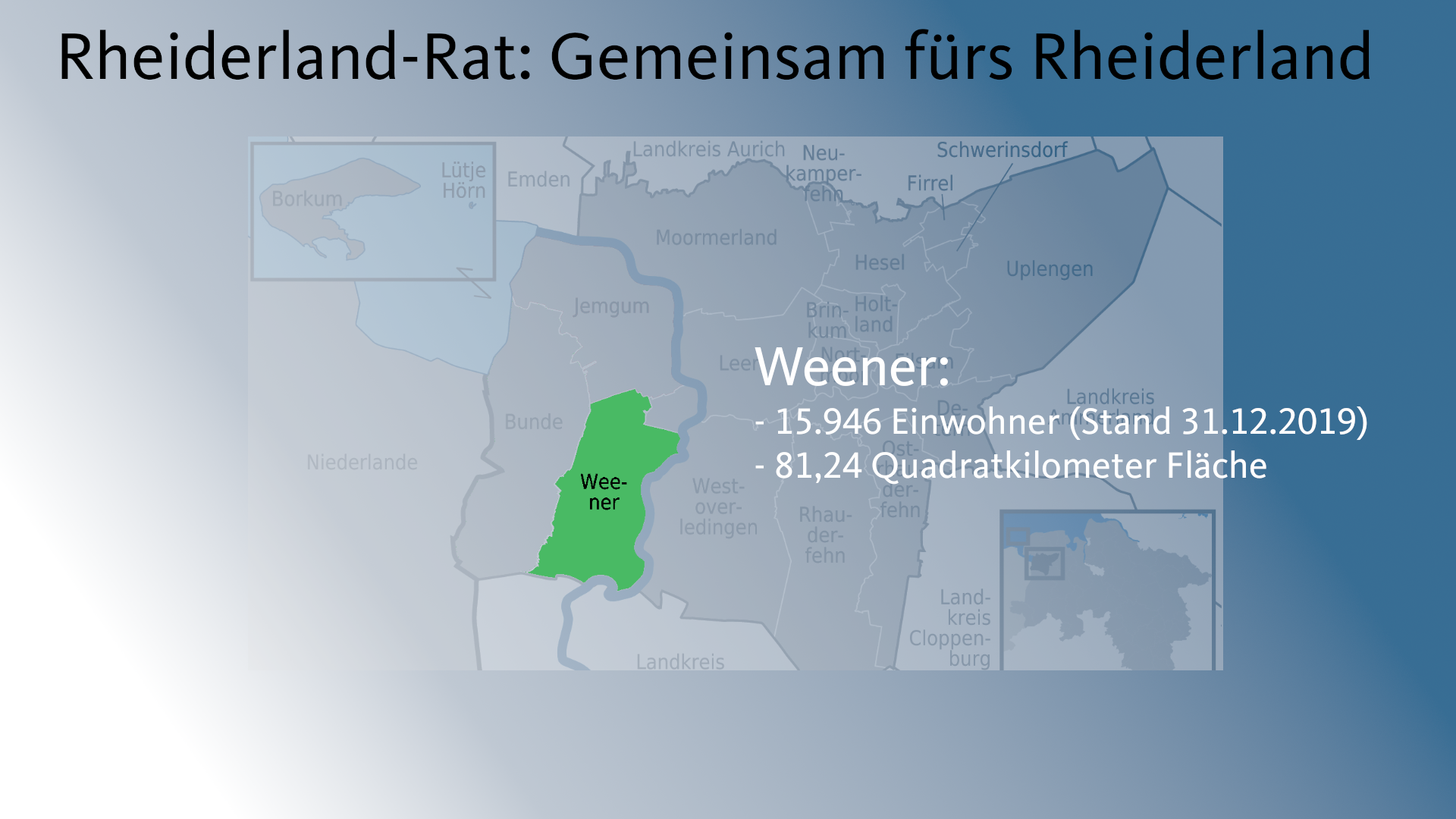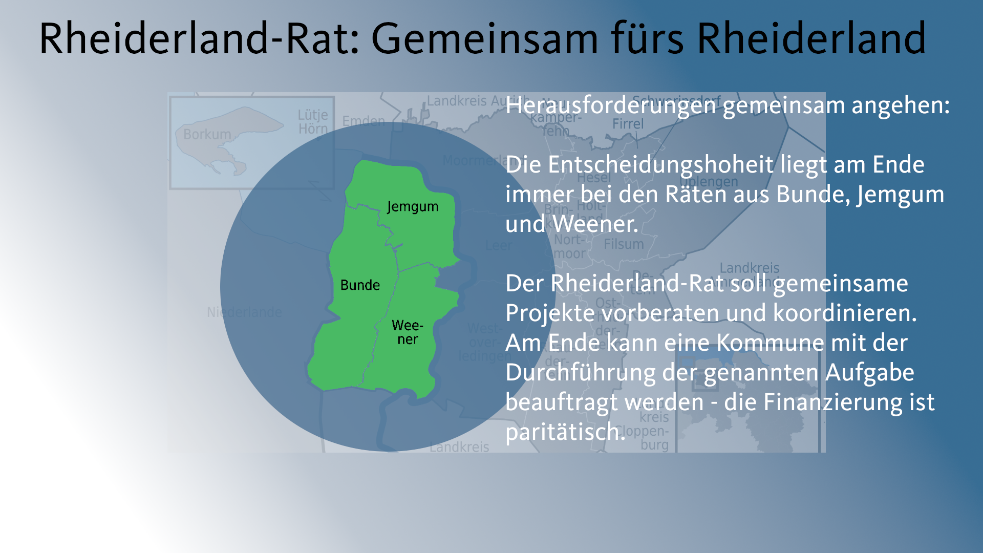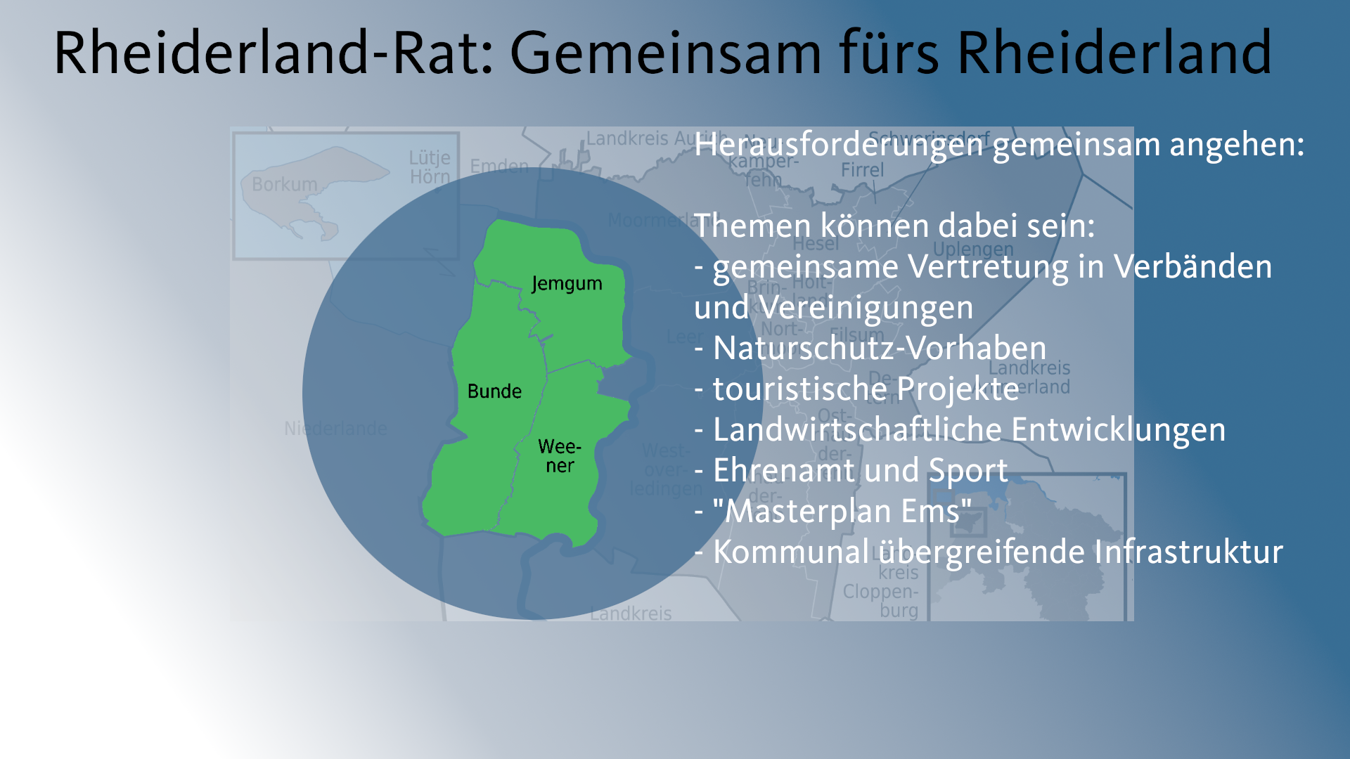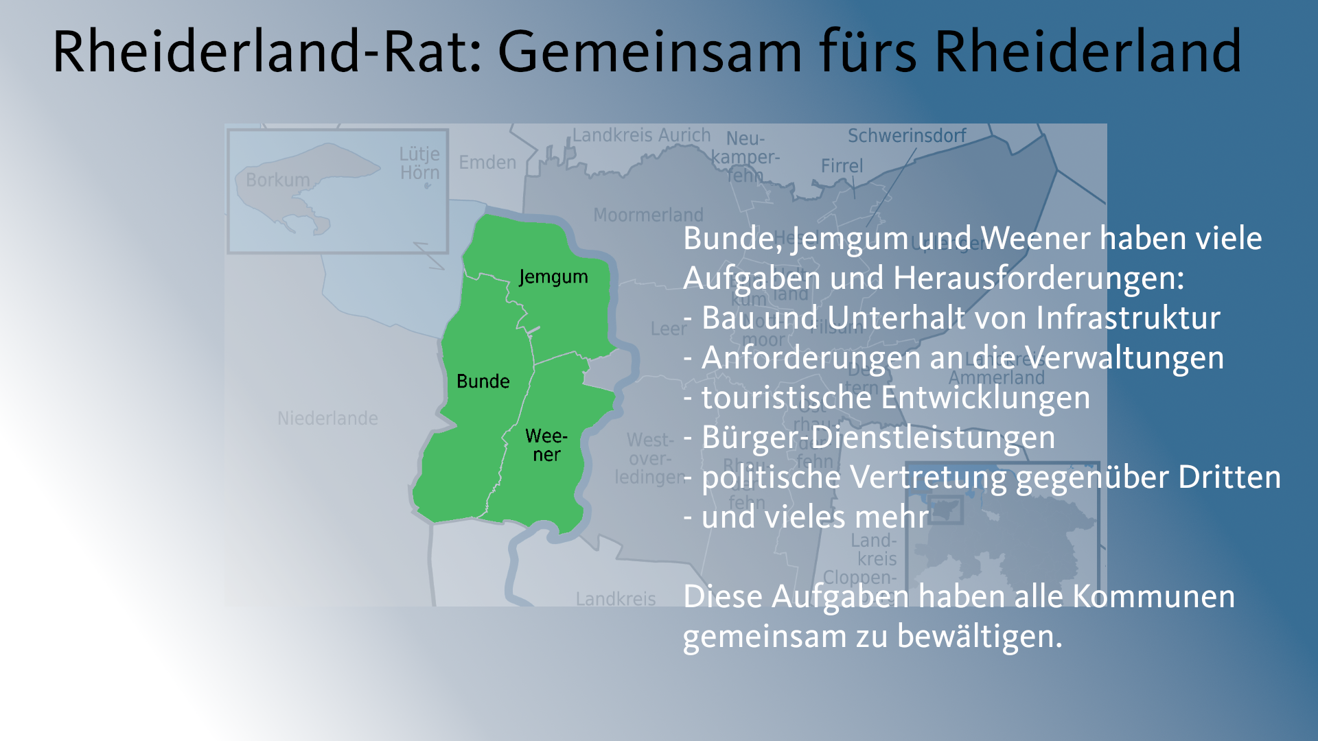 Bunde, Jemgum, Weener – Eigentlich sind wir doch alle Rheiderländer. Darum sollten wir auch enger miteinander zusammenarbeiten. Meine Idee (hier zum Download in Textform) dafür ist der Rheiderland-Rat. Hier gibt es alle Infos dazu – Scrollt Euch einfach durch die Präsentation.